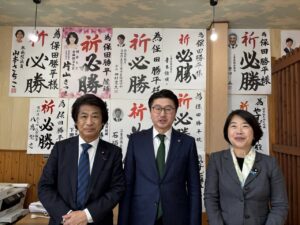 先日、田村憲久代議士と山本さちこ参議院議員が激励に来ていただきました。